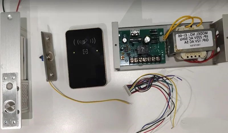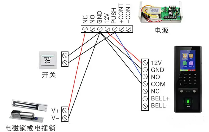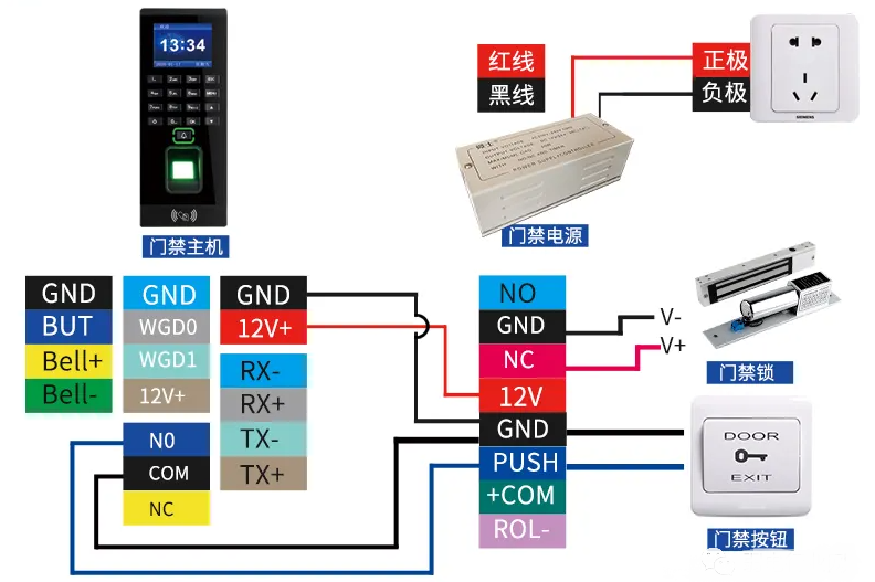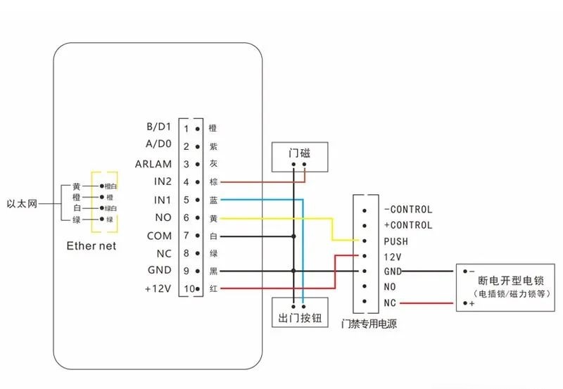 一体机、门禁专用电源、电插锁、出门按钮、端子线